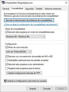 - Al archivo RogueSpear.exe hay que ponerlo como modo de compatibilidad Windows 98 / Windows Me. Modo de color reducido: Color de 16 bits. Activar casillas «Ejecutar con una resolución de pantalla de 640 x 480«, y «Ejecutar esta aplicación como administrador«. (a las opciones se accede con botón derecho encima del archivo / Propiedades / pestaña Compatibilidad).