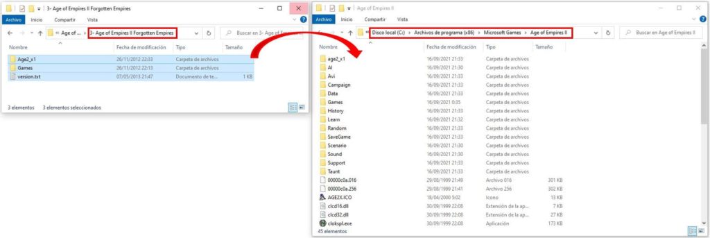 - Para instalar la expansión Forgotten Empires, simplemente copiar todo el contenido de la carpeta 3- Age of Empires II Forgotten Empires en la ruta de instalación del juego: C:\Program Files (x86)\Microsoft Games\Age of Empires II.