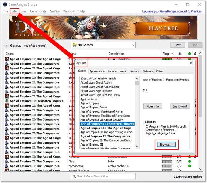 - Abrir GameRanger y configurar la ubicación del juego: Desde el menú Edit/Options…