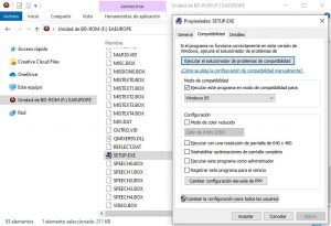 - Buscar el archivo SETUP.exe, botón derecho encima / Propiedades, pestaña Compatibilidad, y activar la casilla «Ejecutar este programa en modo de compatibilidad para:» Windows 95